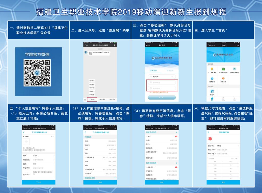 今年我院首次啟用移動(dòng)迎新,8月份以來(lái)迎新系統(tǒng)面向2019級(jí)新開(kāi)放,新生關(guān)注“福建衛(wèi)生職業(yè)技術(shù)學(xué)院”公眾號(hào)后,進(jìn)入“移動(dòng)迎新”頁(yè)面,完善個(gè)人信息、軍訓(xùn)服裝尺碼選擇、綠色通道(學(xué)費(fèi)緩交申請(qǐng))等。新生報(bào)到當(dāng)天,出示迎新線上生成的身份二維碼,迎新老師通過(guò)學(xué)生二維碼,來(lái)確認(rèn)學(xué)生報(bào)到情況,便捷了新生報(bào)到流程,提高了迎新效率,同時(shí)也實(shí)現(xiàn)了迎新數(shù)據(jù)的實(shí)時(shí)可視化。