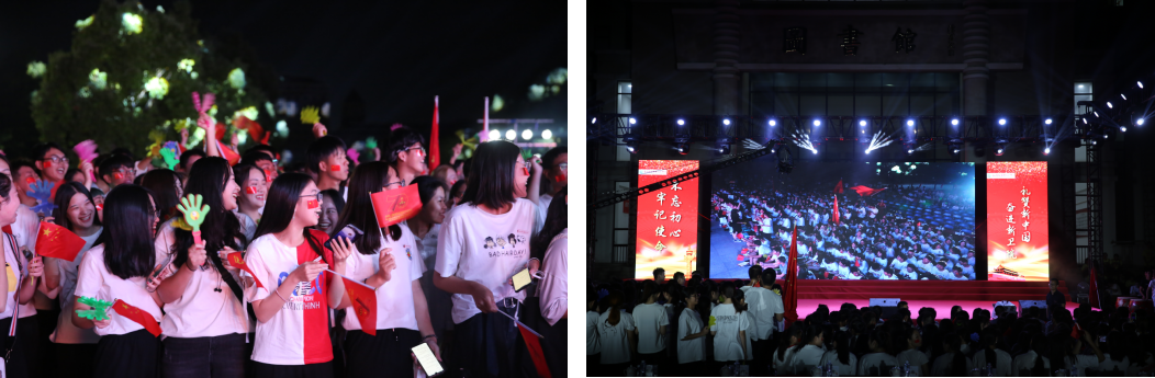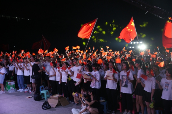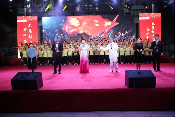 院關(guān)工委領(lǐng)導(dǎo)嚴(yán)肅主任也出席活動(dòng),并與5位演職人員上臺(tái)共同唱響《我和我的祖國(guó)》。在他們的帶動(dòng)下,全場(chǎng)起立,800人共同揮舞手中的國(guó)旗,唱出心中對(duì)祖國(guó)的無(wú)限深情,歌聲響徹學(xué)院上空。