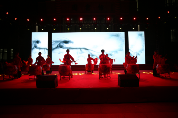 紅衣翩翩,鼓點(diǎn)陣陣,晚會(huì)由護(hù)理系、藥學(xué)系選送的水鼓舞表演《龍的傳人》拉開(kāi)序幕。