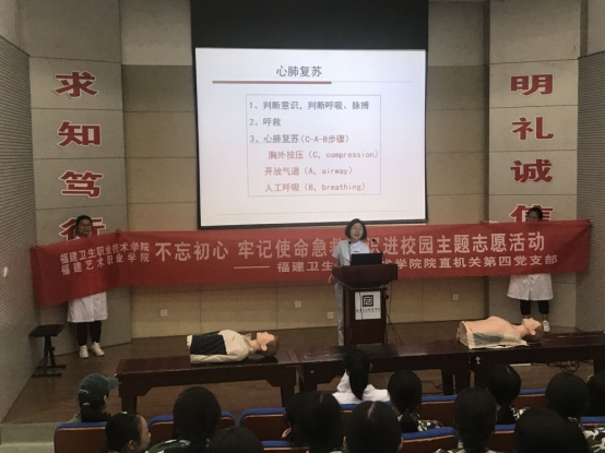 在“不忘初心、牢記使命”主題教育熱烈開展之際,10月24日,我校直屬機關(guān)第四黨支部聯(lián)合福建藝術(shù)職業(yè)學(xué)院,舉辦“急救知識進校園”主題志愿活動。本次志愿活動作為省藝職院軍訓(xùn)生命健康教育的一項重要內(nèi)容,實現(xiàn)了急救知識科普對藝職院全體2019級新生的全覆蓋。