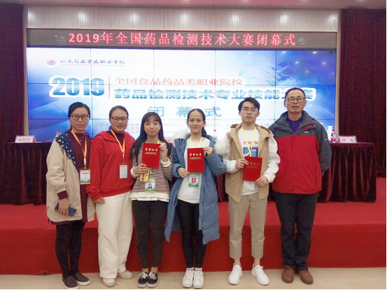 2019年全國食品藥品類職業(yè)院?!八幤窓z測技術(shù)”技能大賽于11月1至3日在山東藥品食品職業(yè)學(xué)院舉行。藥學(xué)系黃智偉、陳雪萍、吳婉婷三名同學(xué)組成的學(xué)生團(tuán)隊榮獲團(tuán)體二等獎的好成績。