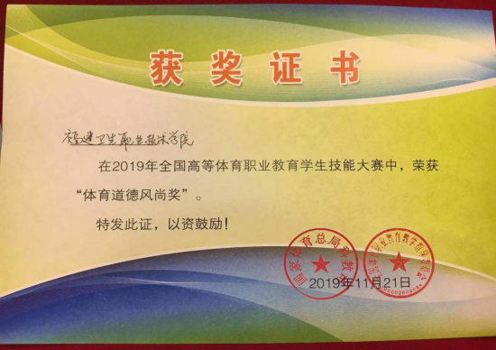 11月22日,全國高等體育職業(yè)教育學(xué)生技能大賽在美麗的海濱城市珠海落下帷幕,我校管理系體育保健與康復(fù)專業(yè)3名選手組成代表隊(duì)榮獲“體育道德風(fēng)尚獎(jiǎng)”。參賽選手18級(jí)體育保健與康復(fù)專業(yè)301班楊浩、鄭鳳龍、劉雪琴榮獲“健身指導(dǎo)技能”比賽團(tuán)體三等獎(jiǎng)。
