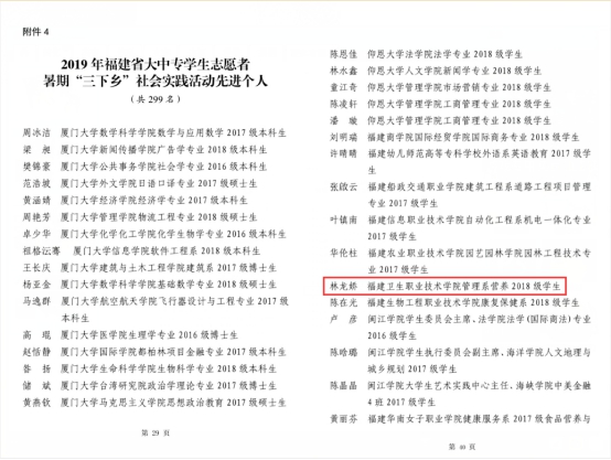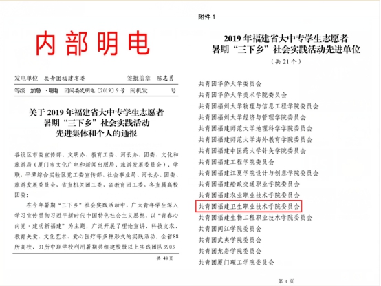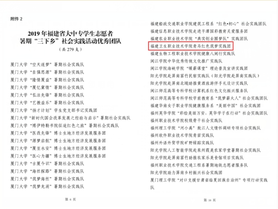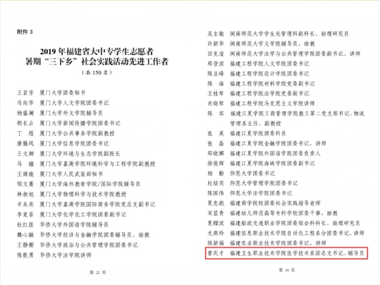 近日,中共福建省委宣傳部、中國(guó)福建省委文明辦、中共福建省委教育工委、福建省河長(zhǎng)制辦公室、共青團(tuán)福建省委、福建省文化和旅游廳、福建省學(xué)生聯(lián)合會(huì)聯(lián)合下發(fā)《關(guān)于2019年福建省大中專學(xué)生志愿者暑期“三下鄉(xiāng)”社會(huì)實(shí)踐活動(dòng)先進(jìn)集體和先進(jìn)個(gè)人的通報(bào)》(團(tuán)閩委發(fā)明電〔2019〕9號(hào)),我校榮獲福建省大中專學(xué)生志愿者暑期“三下鄉(xiāng)”社會(huì)實(shí)踐活動(dòng)先進(jìn)單位,福建衛(wèi)生職業(yè)技術(shù)學(xué)院青馬紅色筑夢(mèng)實(shí)踐團(tuán)獲福建省大中專學(xué)生志愿者暑期“三下鄉(xiāng)”社會(huì)實(shí)踐活動(dòng)優(yōu)秀團(tuán)隊(duì),醫(yī)學(xué)技術(shù)系團(tuán)總支書記、輔導(dǎo)員曾慶才獲福建省大中專學(xué)生志愿者暑期“三下鄉(xiāng)”社會(huì)實(shí)踐活動(dòng)先進(jìn)工作者,管理系醫(yī)學(xué)營(yíng)養(yǎng) 2018 級(jí)學(xué)生林龍嬌同學(xué)獲福建省大中專學(xué)生志愿者暑期“三下鄉(xiāng)”社會(huì)實(shí)踐活動(dòng)先進(jìn)個(gè)人。