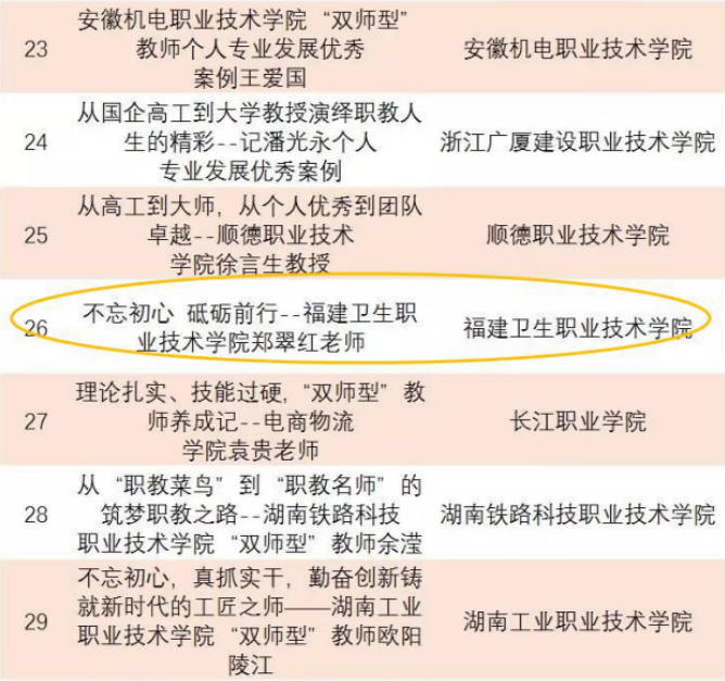 根據(jù)教育部職業(yè)技術(shù)教育中心研究所《關(guān)于全國(guó)職業(yè)院校“雙師型”教師隊(duì)伍建設(shè)典型案例遴選結(jié)果名單的公示》(教職所[2019]304號(hào)),我校副校長(zhǎng)、護(hù)理系教授、護(hù)理專業(yè)帶頭人鄭翠紅的《不忘初心 砥礪前行》案例入選2019年度全國(guó)職業(yè)院校“雙師型”教師個(gè)人專業(yè)發(fā)展典型案例,此次全國(guó)教師個(gè)人典型案例福建省僅有3所高職院校入選。鄭翠紅副校長(zhǎng)還入選2019年福建醫(yī)學(xué)科技獎(jiǎng)專業(yè)組評(píng)審?fù)ㄟ^(guò)項(xiàng)目公示名單。