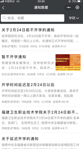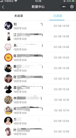 學(xué)院的通知一經(jīng)發(fā)布,各輔導(dǎo)員即在班級(jí)群予以轉(zhuǎn)發(fā),通過(guò)平臺(tái)統(tǒng)計(jì),學(xué)生管理部門可以即時(shí)獲取閱讀情況,可以準(zhǔn)確看到班級(jí)群里哪些學(xué)生已閱讀,哪些學(xué)生還未閱讀,閱讀率是多少等信息。