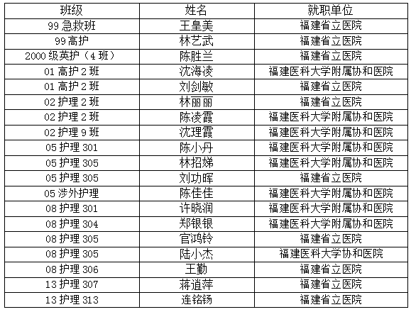 石湖建,畢業(yè)于2014級護(hù)理301班,現(xiàn)于福建醫(yī)科大學(xué)附屬協(xié)和醫(yī)院工作。輔導(dǎo)員吳薇老師談到該生時說:石湖建同學(xué)在校期間積極向上,刻苦努力,不怕困難,是一個陽光大氣的帥男孩。在校期間擔(dān)任班級的體育委員,并積極參與各項體育活動。工作中可以看出其具有膽大心細(xì)、責(zé)任心強(qiáng)、有擔(dān)當(dāng)?shù)葍?yōu)秀品質(zhì)。