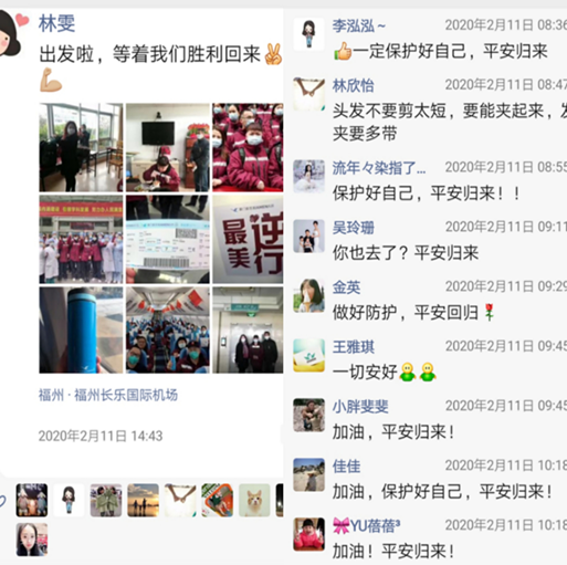 她們雖不同在一個(gè)地方,每天戰(zhàn)“疫”歸來,卻不忘互相問候,互相打氣,因?yàn)樗齻兌济靼走@是一場無硝煙的戰(zhàn)“疫”,必將不負(fù)眾望,平安歸來!