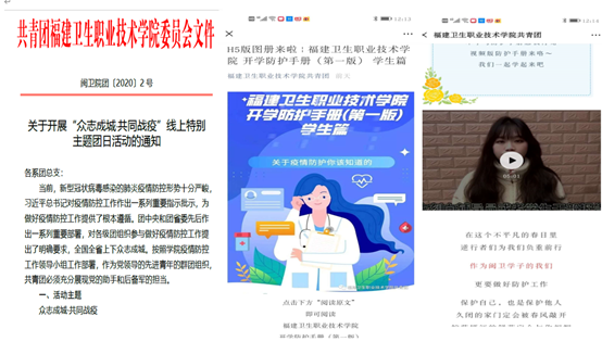 統(tǒng)一部署、精心組織實施。校團委統(tǒng)一部署,各系團總支精心組織,各級團學(xué)組織群策群力,通過網(wǎng)絡(luò)以班級團支部為單位開展“眾志成城,共同戰(zhàn)役”線上主題團日活動,覆蓋全校219個班級團支部。團學(xué)干部積極貢獻智慧以師生喜聞樂見的方式制作《福建衛(wèi)生職業(yè)技術(shù)學(xué)院師生員工的開學(xué)防護手冊》圖文、H5、視頻等版本。