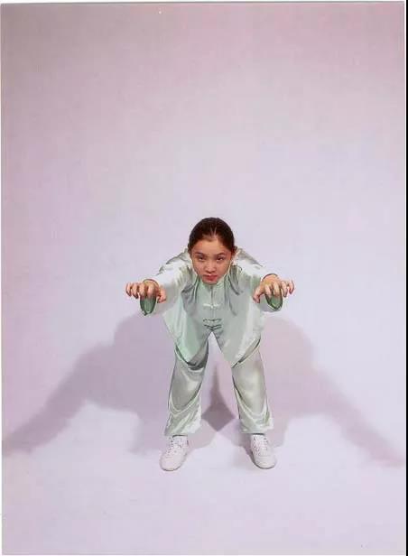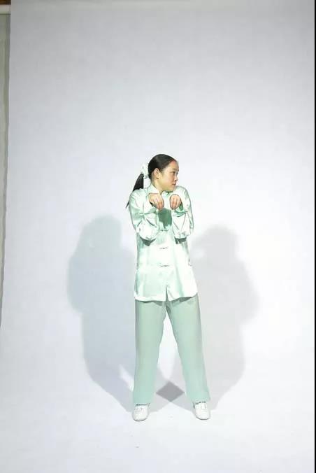 手握空拳兩側(cè)起;挺胸塌腰向前伸;