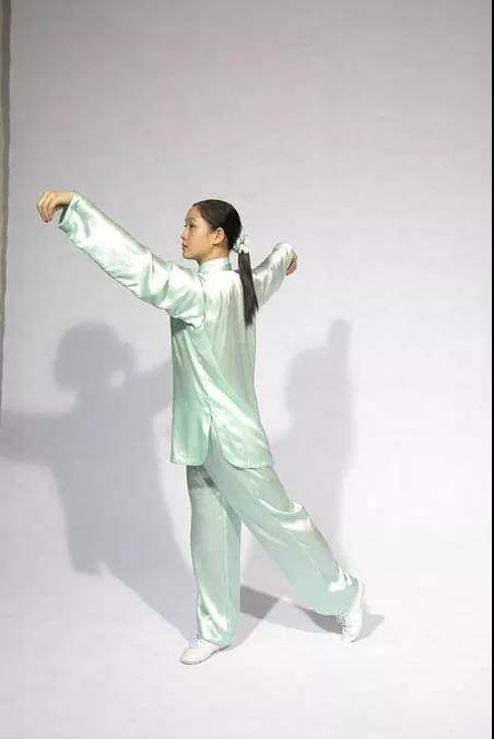 腳尖外展手?jǐn)[起;肘抵腰側(cè)上臂舉;