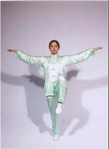 兩腿微屈掌相對(duì);提膝展翅側(cè)平舉;