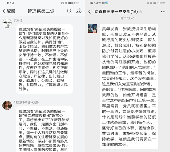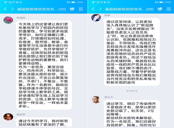 在線學(xué)習(xí)結(jié)束后,各支部組織黨員開展了學(xué)習(xí)交流活動,大家表示通過課程學(xué)習(xí),對新型冠狀病毒的來源和特性,傳播特點(diǎn)和傳播途徑,新冠肺炎患者的臨床表現(xiàn)以及臨床診治效果等知識有了更深入、更系統(tǒng)的了解。對如何正確戴口罩?如何正確地打噴嚏?如何正確洗手?如何在宿舍、圖書館、教室、食堂等學(xué)習(xí)生活場景中進(jìn)行科學(xué)防護(hù)?等具體防控措施有了更明確的答案。