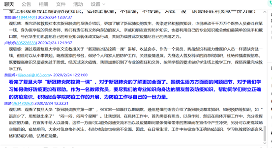 同志們贊嘆兩位教授的精彩講授,更欽佩他們作為共產(chǎn)黨員帶頭奮戰(zhàn)在防疫第一線所展現(xiàn)出的堅(jiān)強(qiáng)黨性。面對疫情,張文宏教授說:“黨員要上前線,現(xiàn)在就是前線,沒有討價(jià)還價(jià)的余地,我是支部書記,我先上,別的黨員也必須頂上?!边@是此時(shí)此刻對疫情防控第一線醫(yī)護(hù)黨員的要求,也是全院師生黨員應(yīng)自覺奉行的行為準(zhǔn)則。