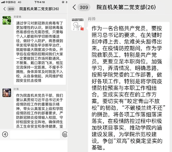 疫情發(fā)生以來,學(xué)院成立了14支黨員突擊隊(duì),組織師生黨員積極投入到校園和社區(qū)的各項(xiàng)防疫工作當(dāng)中,在防疫宣傳教育、在線教學(xué)、心理健康教育支持服務(wù)、學(xué)生管理等方面做了大量工作。當(dāng)前,疫情防控還遠(yuǎn)未結(jié)束,全院師生黨員將認(rèn)真落實(shí)黨中央、省委及省委教育工委的各項(xiàng)防控要求,在疫情防控中踐行黨的初心和使命,發(fā)揮黨員干部的先鋒模范作用。