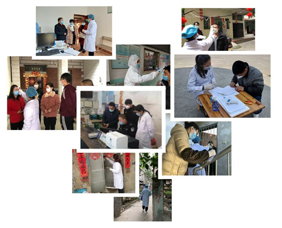 預(yù)防班林芬(中間)參與居家隔離人員測量體溫工作