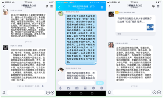 入黨積極分子護理系易班工作站站長18護理308班黃雯瀾同學說到:“ 90后是青春的一代,是奮斗的一代,在此次抗擊新冠肺炎疫情防控斗爭中,有1.2萬名醫(yī)護人員就是‘90后’。這些只比我稍大的同齡人,沖在抗疫一線不畏艱險、舍生忘死,彰顯了青春的蓬勃力量??倳浾f:青年一代有理想、有本領(lǐng)、有擔當,國家就有前途,民族就有希望。作為一名學生入黨積極分子,我要時刻以這些‘90后’青年黨員為榜樣嚴格要求自己,珍惜學習時光,將個人的成長同國家和民族的命運的發(fā)展聯(lián)系在一起。希望有朝一日我也能同他們一樣為祖國做出自己的貢獻!”