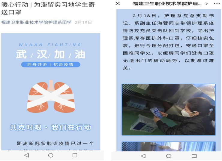 排各班級(jí)進(jìn)行調(diào)查摸排,準(zhǔn)確掌握每一個(gè)學(xué)生的活動(dòng)軌跡以及健康狀況。在摸排過(guò)程中,得知滯留于實(shí)習(xí)地的學(xué)生存在缺少口罩的困難。護(hù)理系黨總支疫情防控黨員突擊隊(duì)迅速行動(dòng),協(xié)調(diào)從護(hù)理系實(shí)訓(xùn)儲(chǔ)備物資中調(diào)撥部分口罩,寄送口罩至困難同學(xué)處,幫助滯留于實(shí)習(xí)地的學(xué)生解決實(shí)際困難。