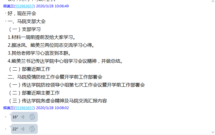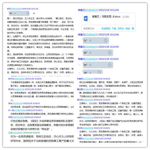 2020年3月28日上午,直屬馬克思主義學(xué)院黨支部召開線上黨員大會,集中學(xué)習(xí)《新時代高等學(xué)校思想政治理論課教師隊(duì)伍建設(shè)規(guī)定》《教育部有關(guān)部門負(fù)責(zé)人就<新時代高等學(xué)校思想政治理論課教師隊(duì)伍建設(shè)規(guī)定>答問》等6份文件。會議由黨支部書記熊美蘭主持,全體教師黨員參加了會議。教師們在會議上暢談心得和感想,掀起學(xué)習(xí)討論熱潮。