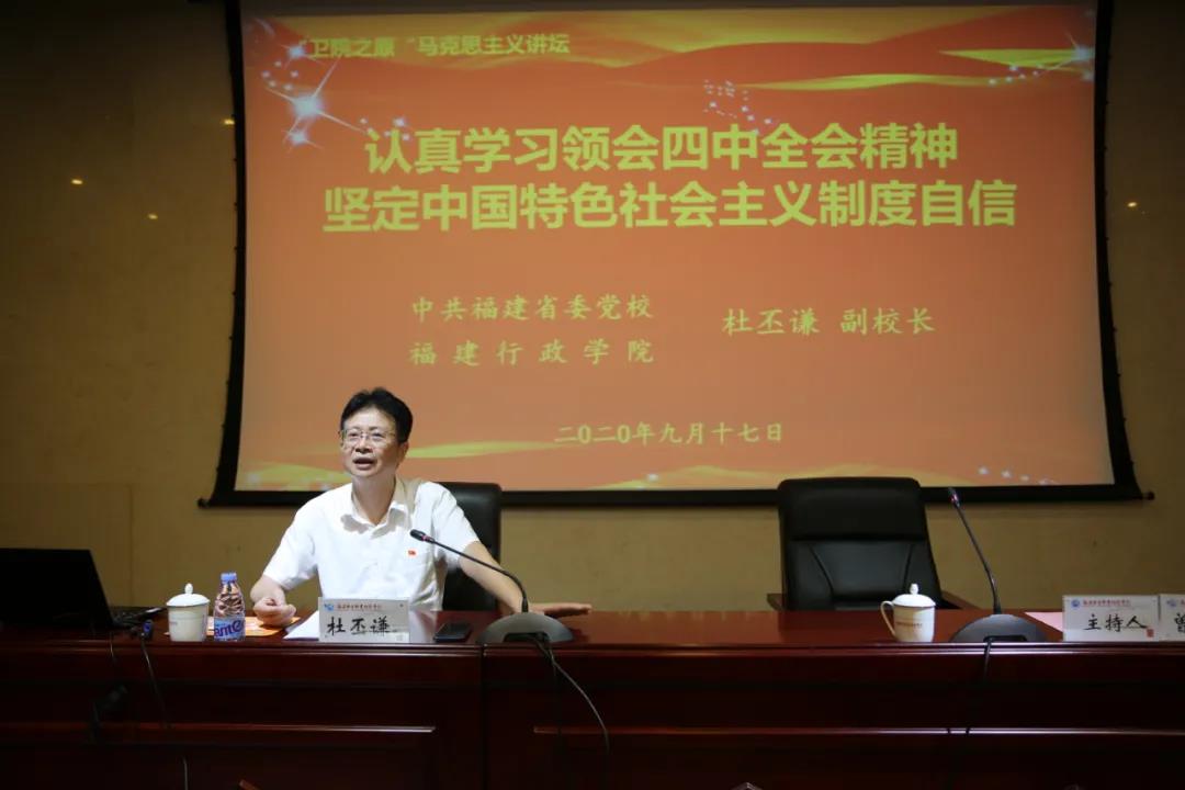 9月17日下午,黨委書記曾武祈在實(shí)訓(xùn)樓四樓報告廳主持召開黨委中心組學(xué)習(xí)(擴(kuò)大)會議,邀請福建省委黨校行政學(xué)院副校長杜丕謙教授為學(xué)院師生作題為《認(rèn)真學(xué)習(xí)領(lǐng)會四中全會精神 堅定中國特色社會主義制度自信》專題輔導(dǎo)報告。