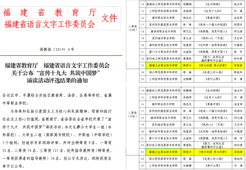 近日,福建省教育廳、福建省語言文字工作委員會關(guān)于公布“宣傳十九大共筑中國夢”誦讀活動評選結(jié)果,我院護(hù)理系陳俊興同學(xué)、臨床醫(yī)學(xué)系史嘉輝同學(xué)分別獲二等獎、三等獎。指導(dǎo)老師為宋秋瓊。