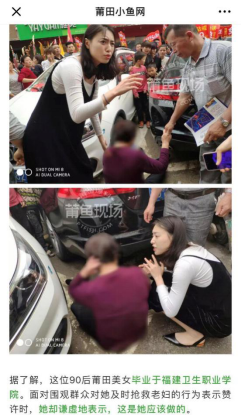 原來是4月20日,莆田黃石舉行盛大的民俗出游活動,數(shù)以萬計的市民圍觀。活動中,一名七旬老婦人不知為何倒地不起,圍觀群眾束手無策。就在這危急時刻,人群中擠過一位女孩,趴在老婦人身邊實施急救,又附身為老婦人喂水,直到老人醒來。經(jīng)過詢問,原來這位老人家患有高血壓、糖尿病,加上午后氣溫升高,致使老人突發(fā)不適暈倒在地。看著老人轉(zhuǎn)危為安,周圍人群紛紛向這位黑衣女孩投來贊許的目光。女孩卻謙虛地表示,她畢業(yè)于福建衛(wèi)生職業(yè)技術學院,這是她應該做的。