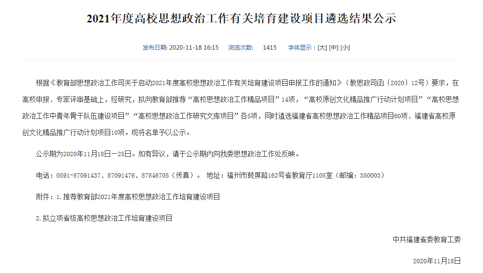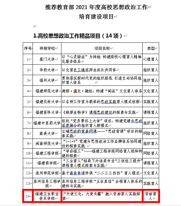 近日,中共福建省委教育工委2021年度高校思想政治工作有關(guān)培育建設(shè)項目公布了公示名單,我校學生工作部資助管理中心申報的“‘天使文化,大愛無疆’融入資助育人實踐探索”項目,擬立項省級高校思想政冶工作培育建設(shè)項目,并且擬作為我省“高校思想政冶工作精品項目”向教育部推薦。特別值得一提的是:我省擬向教育部推薦的精品項目共14項,其中13項均為本科院校項目,我校學生工作部申報的項目,是唯一一所高職院校項目。