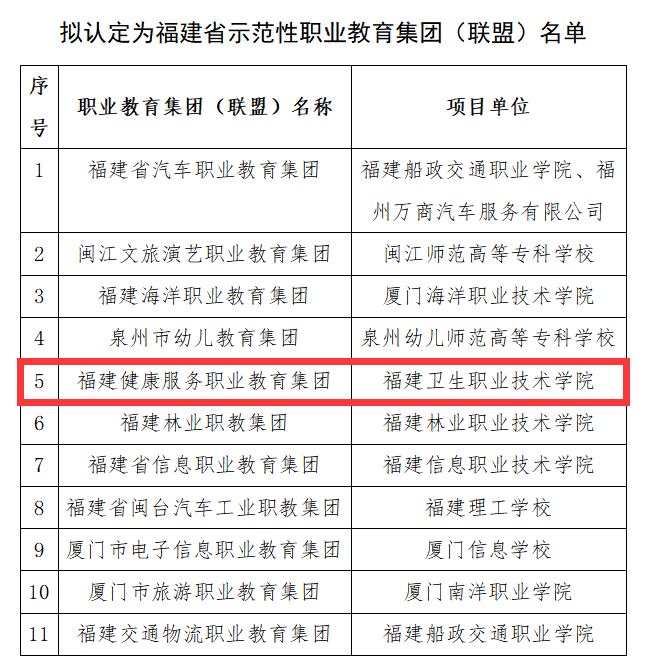 根據(jù)福建省教育廳《關(guān)于福建省示范性職業(yè)教育集團(tuán)(聯(lián)盟)的公示》,由我校牽頭組建的福建健康服務(wù)職業(yè)教育集團(tuán)獲評(píng)福建省示范性職業(yè)教育集團(tuán)。據(jù)悉,本次全省共有11所職業(yè)教育集團(tuán)被認(rèn)定為示范性職業(yè)教育集團(tuán)。