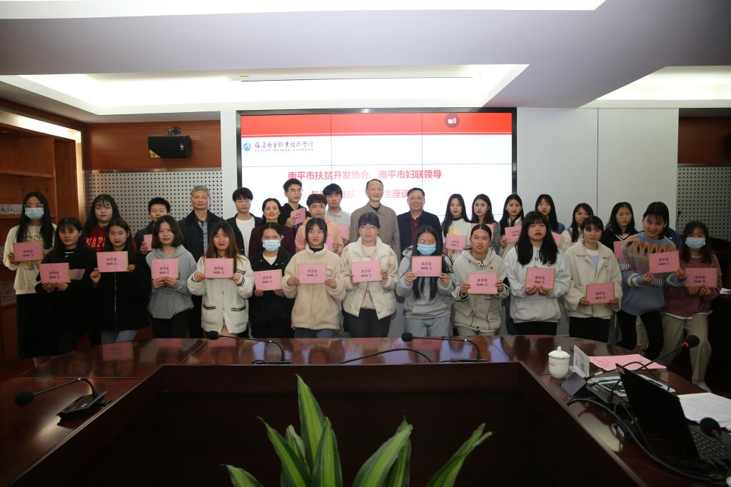 12月28日下午,南平市扶貧開(kāi)發(fā)協(xié)會(huì)會(huì)長(zhǎng)柳貴清、南平市婦聯(lián)副主席黃萍等一行5人蒞臨我校,看望、慰問(wèn)原“中職護(hù)理專(zhuān)業(yè)精準(zhǔn)技術(shù)扶貧班”升入我校高職的27名同學(xué),并與他們座談。校黨委書(shū)記曾武祈、副院長(zhǎng)黃銘珊參加了會(huì)議,學(xué)生工作部、護(hù)理學(xué)院、藥學(xué)院、醫(yī)學(xué)技術(shù)系、健康管理系負(fù)責(zé)人、有關(guān)班級(jí)輔導(dǎo)員一同參會(huì)。座談會(huì)由學(xué)工部部長(zhǎng)宋維主持。