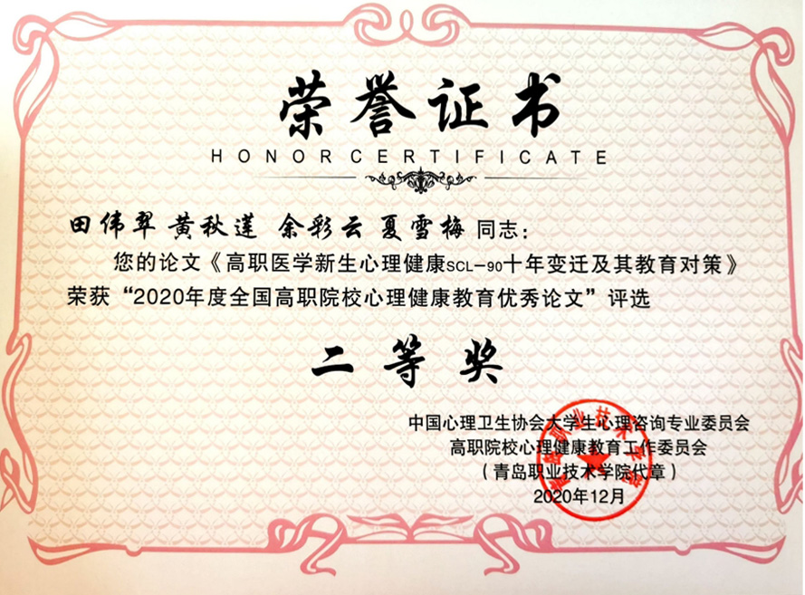 2020年12月18日,接中國心理衛(wèi)生協(xié)會大學生心理咨詢專業(yè)委員會高職院校心理健康教育工作委員會下發(fā)的全國高職心教(2020)4號文件,健康管理系教師田偉翠、黃秋蓮、余彩云和夏雪梅撰寫的論文《高職醫(yī)學新生心理健康SCL-90十年變遷及其教育對策》榮獲“2020年度全國高職院校心理健康教育優(yōu)秀論文”二等獎。