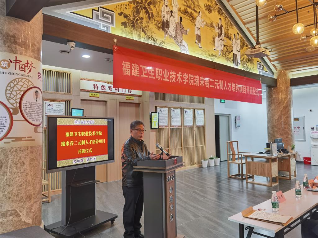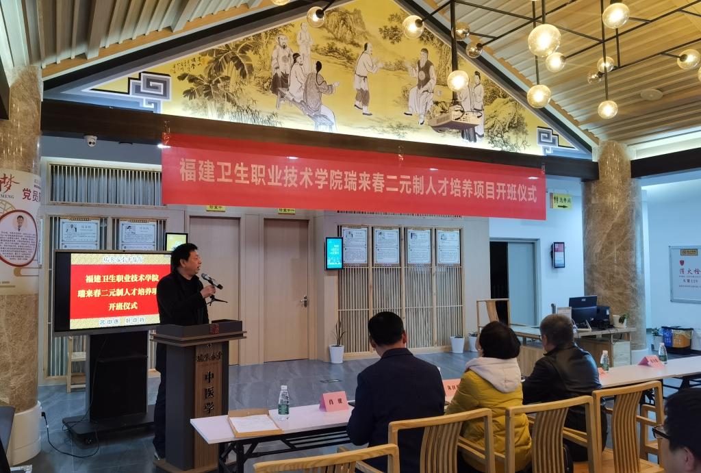 隨后,陳貞健致辭,他對各位順利錄取的學(xué)員們表示熱烈祝賀,并感謝企業(yè)方在二元制項目上的大力支持與配合。他為大家介紹了二元制的七個“二元”特征,指出職業(yè)教育人才培養(yǎng)的新模式,是以全面提升勞動者技術(shù)技能水平和職業(yè)素養(yǎng)為目的,解決企業(yè)職工能力提升難題,解決工作與學(xué)歷晉升相沖突的難題,通過二元制的模式實現(xiàn)崗位與課堂的無縫對接,教學(xué)相長,促進學(xué)校教師成長和學(xué)員素質(zhì)提升。他預(yù)祝福建衛(wèi)生職業(yè)技術(shù)學(xué)院與福建瑞來春健康管理有限公司合辦的2020級“二元制”人才培養(yǎng)項目能取得圓滿成功,希望企業(yè)本著“名醫(yī)好藥”的理念能夠發(fā)展得越來越好,為社會進步,為中醫(yī)藥發(fā)展做出更多的貢獻。