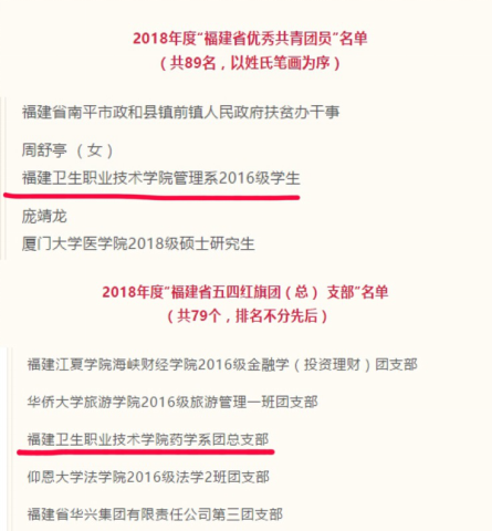 我院管理系2016級學生周舒亭獲2018年度“福建省優(yōu)秀共青團員”稱號,藥學系團總支獲2018年度“福建省五四紅旗團(總) 支部”稱號。