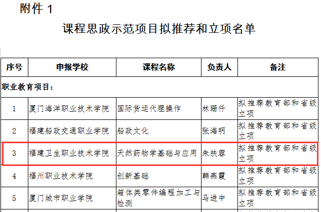 近日,福建省教育廳公布了2021年職業(yè)教育和繼續(xù)教育課程思政示范項目擬推薦和立項名單,我校教務(wù)處處長朱扶蓉教授主持申報的《天然藥物學(xué)基礎(chǔ)與應(yīng)用》獲批擬省級立項并推薦教育部參評國家課程思政示范項目、護(hù)理學(xué)院洪霞教授主持申報的《健康評估》獲批省級立項。這一榮譽(yù)體現(xiàn)了我校切實(shí)貫徹落實(shí)立德樹人根本任務(wù)要求,是我校課程思政教學(xué)改革工作取得新突破的重要標(biāo)志,這將帶動我校專業(yè)教師深化課程思政改革,助力構(gòu)建學(xué)?!叭恕毙赂窬?。