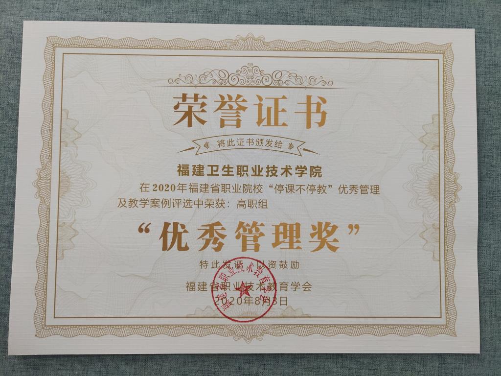 接福建省職業(yè)技術(shù)教育學(xué)會通知,我校在2020年福建省職業(yè)院校“停課不停教” 優(yōu)秀管理及教學(xué)案例評選中榮獲高職組“優(yōu)秀管理獎”。