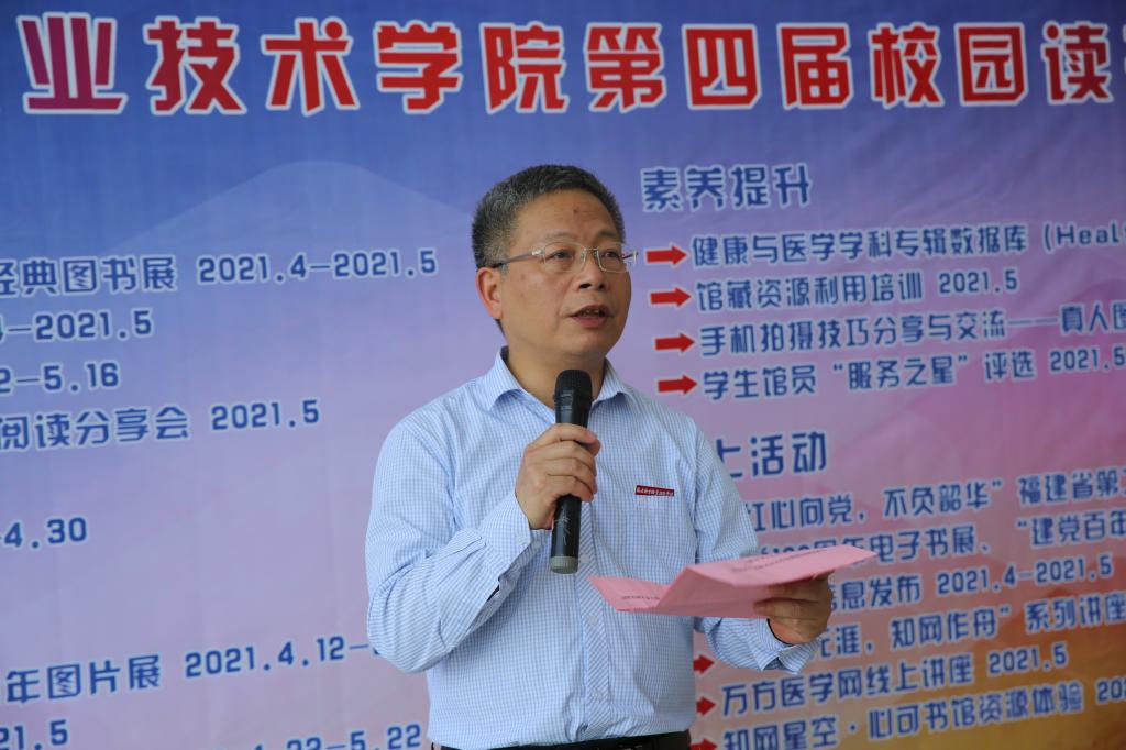 啟動式伊始,陳貞健致辭,他指出近年來黨中央、國務院高度重視全民閱讀,今年又恰逢中國共產黨百年華誕,圖書館充分發(fā)揮自身優(yōu)勢和文化特色,將黨史學習教育與閱讀推廣相結合,通過形式多樣的閱讀推廣和文化交流活動,向廣大師生展示中國共產黨的百年光輝歷程,引導紅色閱讀,厚植文化自信,增強使命擔當。希望廣大師生能以此為契機,養(yǎng)成“愛讀書、多讀書、讀好書”的習慣,厚植“愛國、愛黨、愛?!鼻閼?,珍惜寶貴時光,勤奮學習,力爭在開拓新征程中實現新作為。