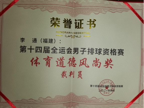 2021年4月1日——4月13日第十四屆全國運動會男子排球成年組(B)資格賽在廣東省江門市舉辦。全國運動會為國內(nèi)成年組級別最高的綜合性運動會,四年一屆。受國家體育總局排球運動管理中心選調(diào),我校體育部李通老師作為執(zhí)法本次賽事的裁判員前往賽區(qū)進行執(zhí)裁。在為期近兩周的封閉管理工作下,圓滿完成了本次賽事的執(zhí)裁工作,受到了賽事組委會及各運動隊的好評,并獲裁判員“體育道德風尚獎”榮譽。