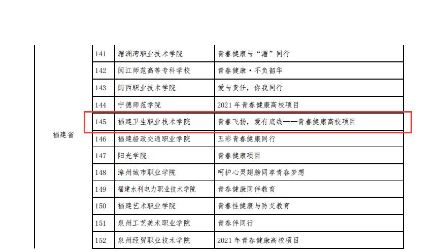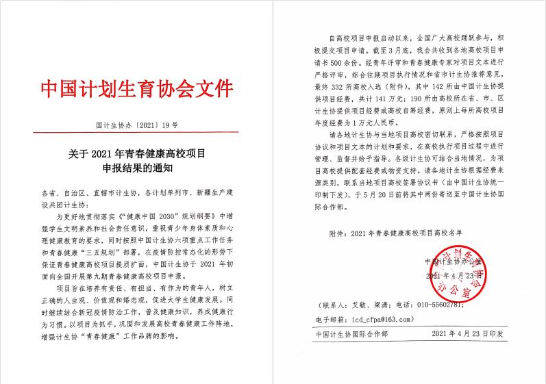 近日,中國(guó)計(jì)生協(xié)下發(fā)通知,通報(bào)2021年青春健康高校項(xiàng)目中標(biāo)結(jié)果。經(jīng)福建省計(jì)生協(xié)會(huì)推薦,我?!扒啻猴w揚(yáng),愛(ài)有底線”項(xiàng)目成功通過(guò)評(píng)審中標(biāo)!