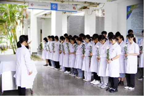 參加活動的師生集體行默哀禮,感恩無言良師,隨后大家向大體老師鞠躬并敬獻(xiàn)鮮花,表達(dá)敬意與追思。