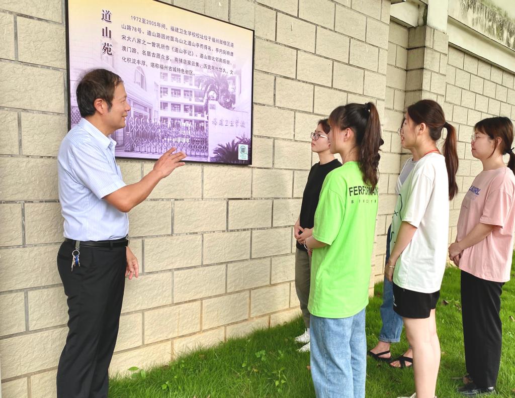 洪常青老師向?qū)W生講解公寓樓命名的內(nèi)涵意義。