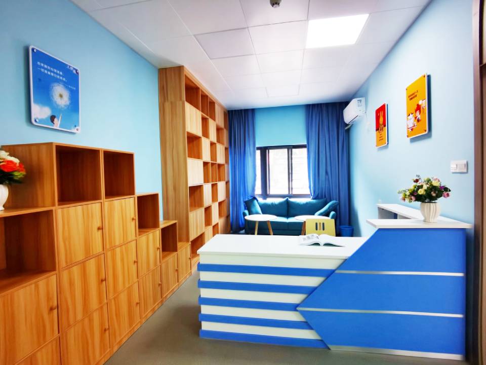 接待區(qū)是供來訪者進行心理咨詢預約功能區(qū),藍色為主調(diào)的設計給人予溫和、平靜的舒適感。