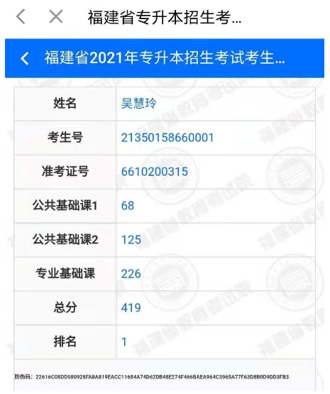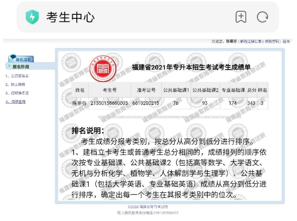 18影像303班陳翠芬同學(xué)的“專升本”考試成績位居檢驗專業(yè)考生第三。