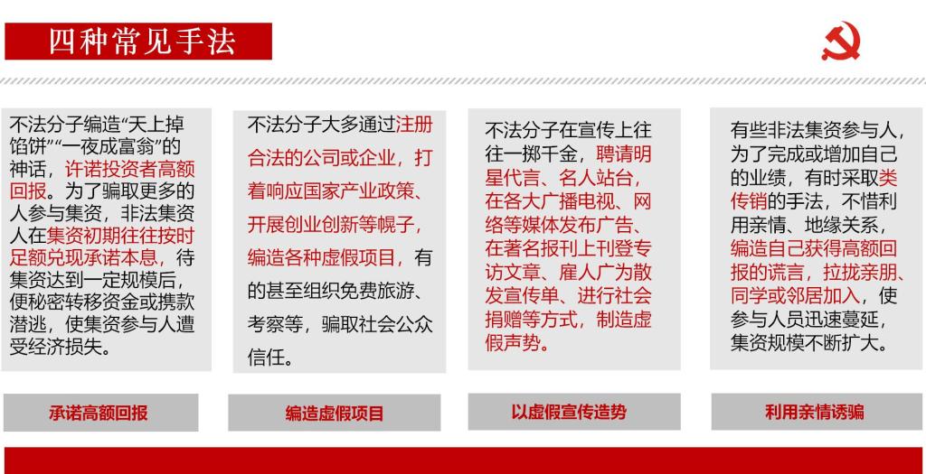 時(shí)刻謹(jǐn)記天上不會(huì)掉餡餅,掉下來(lái)的不是“圈套”就是“陷阱”,不盲目相信所謂的高息“保險(xiǎn)”、高息“理財(cái)”等誘惑。大家要樹(shù)立風(fēng)險(xiǎn)意識(shí),注重信息保護(hù),堅(jiān)守住理性底線(xiàn),牢記高收益意味著高風(fēng)險(xiǎn),堅(jiān)決對(duì)非法集資說(shuō)“不”!