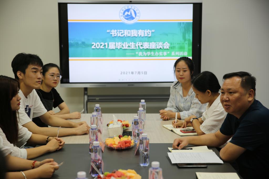 7月5日,2021屆學(xué)生即將畢業(yè)之際,作為“我為學(xué)生辦實(shí)事”系列活動(dòng)之一,我校黨委書記曾武祈在學(xué)生服務(wù)中心,與10名畢業(yè)生代表敘情誼、話成長(zhǎng),座談會(huì)由學(xué)生工作部部長(zhǎng)宋維主持。