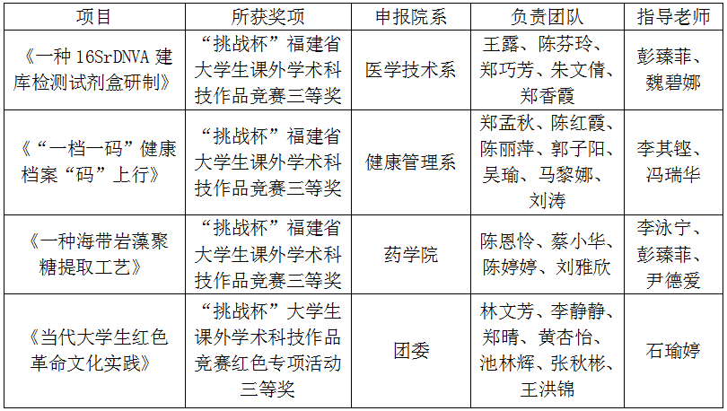 我?!兑环N16SrDNVA建庫檢測(cè)試劑盒研制》《“一檔一碼”健康檔案“碼”上行》和《一種海帶巖藻聚糖提取工藝》共三個(gè)作品榮獲“挑戰(zhàn)杯”福建省大學(xué)生課外學(xué)術(shù)科技作品競(jìng)賽三等獎(jiǎng);《當(dāng)代大學(xué)生紅色革命文化實(shí)踐》榮獲“挑戰(zhàn)杯”大學(xué)生課外學(xué)術(shù)科技作品競(jìng)賽紅色專項(xiàng)活動(dòng)三等獎(jiǎng)。