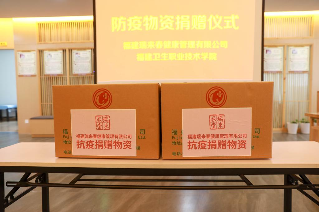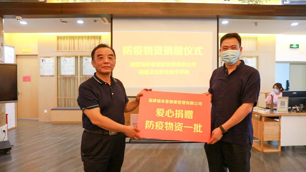 捐贈儀式由何舒瀾主持,游鋒代表我校接受福建瑞來春健康管理有限公司捐贈的一批防疫物資。