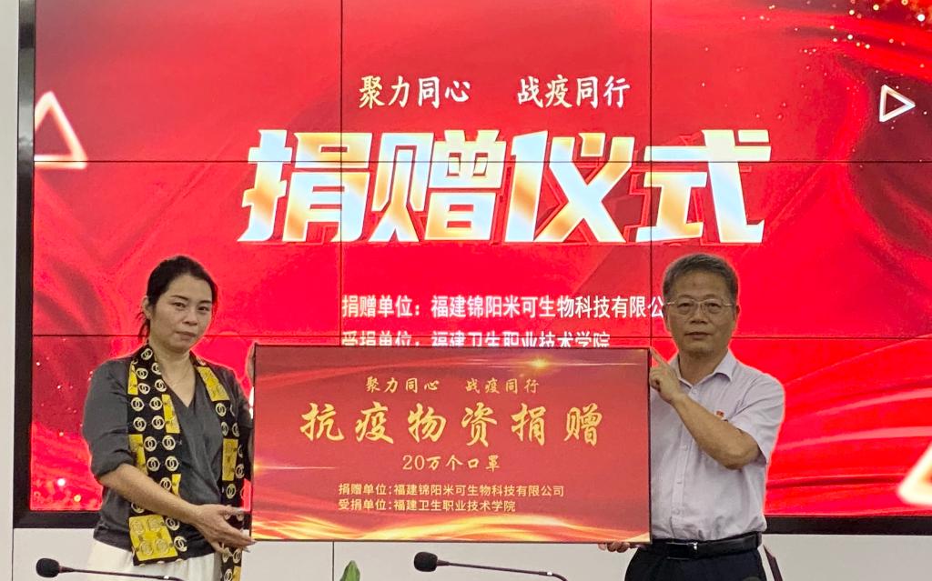 聚力同心,戰(zhàn)疫同行。福建錦陽(yáng)米可生物科技有限公司向我校捐贈(zèng)20萬(wàn)個(gè)口罩,健康管理系黨總支第二支部牽線搭橋,攜手為學(xué)校疫情常態(tài)化防控工作保駕護(hù)航。