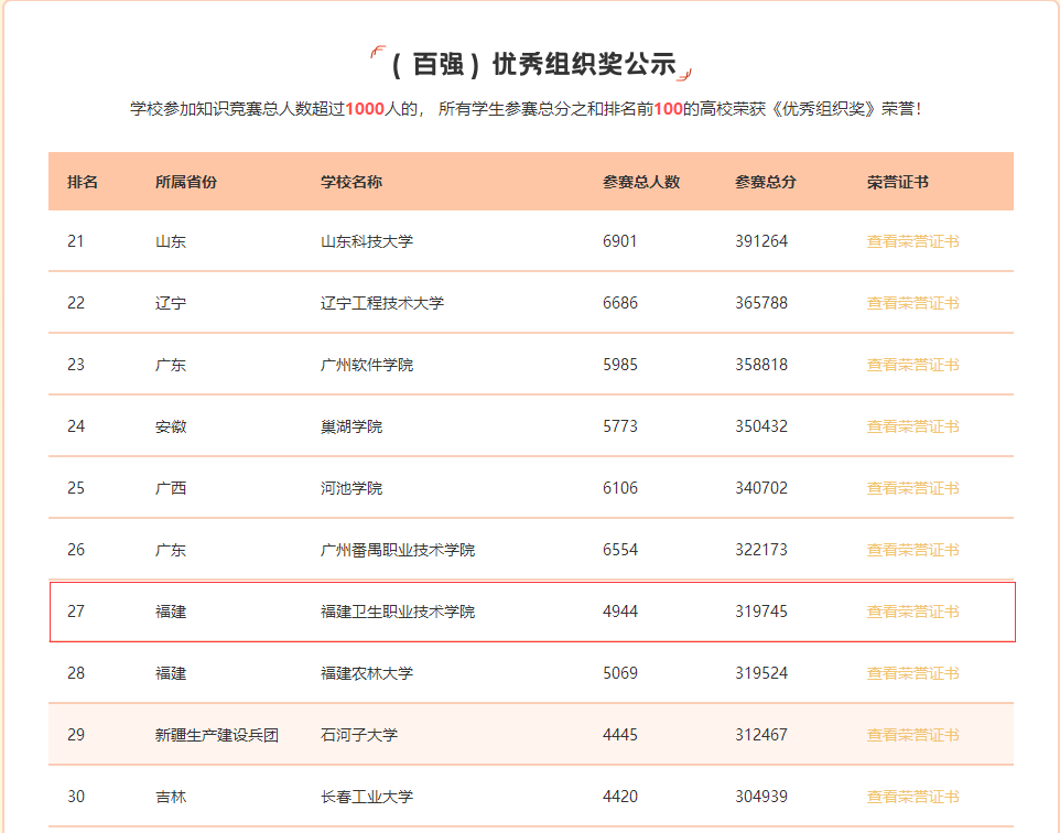 據(jù)悉,本次競(jìng)賽所用試卷由“學(xué)習(xí)強(qiáng)國(guó)”上海學(xué)習(xí)平臺(tái)提供,共吸引了廈門大學(xué)、暨南大學(xué)、石河子大學(xué)、廣州大學(xué)等全國(guó)848所高校54.6萬(wàn)學(xué)生參賽。我校約5000名學(xué)生參與競(jìng)賽,近4000名完成學(xué)習(xí)、競(jìng)賽任務(wù),獲得《電子學(xué)習(xí)證書》,位列全國(guó)第27名、全省高校第3名、全省高職院校第1名。