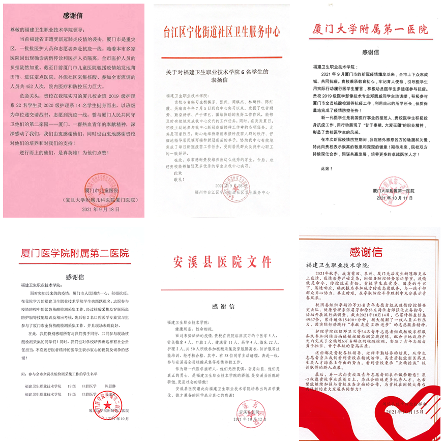 近日,我校先后收到來自廈門市兒童醫(yī)院、寧化街道社區(qū)衛(wèi)生服務(wù)中心、廈門大學(xué)附屬第一醫(yī)院、廈門醫(yī)學(xué)院附屬第二醫(yī)院、安溪縣醫(yī)院、閩侯縣疫情防控指揮部的感謝信,對疫情期間奮戰(zhàn)在抗疫一線的我校青年志愿者進行表揚,對其主動投身疫情防控志愿服務(wù)及認真負責(zé)的工作態(tài)度給予高度肯定,同時對學(xué)校的人才培養(yǎng)工作表示感謝。