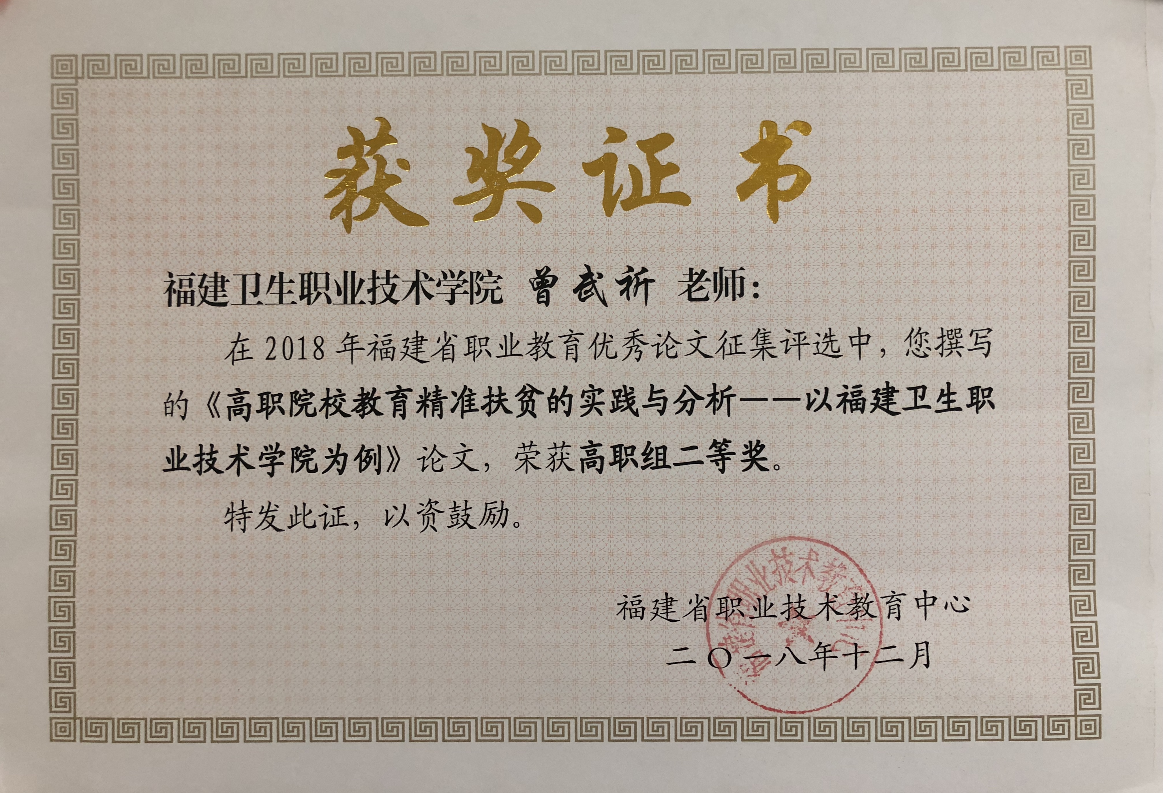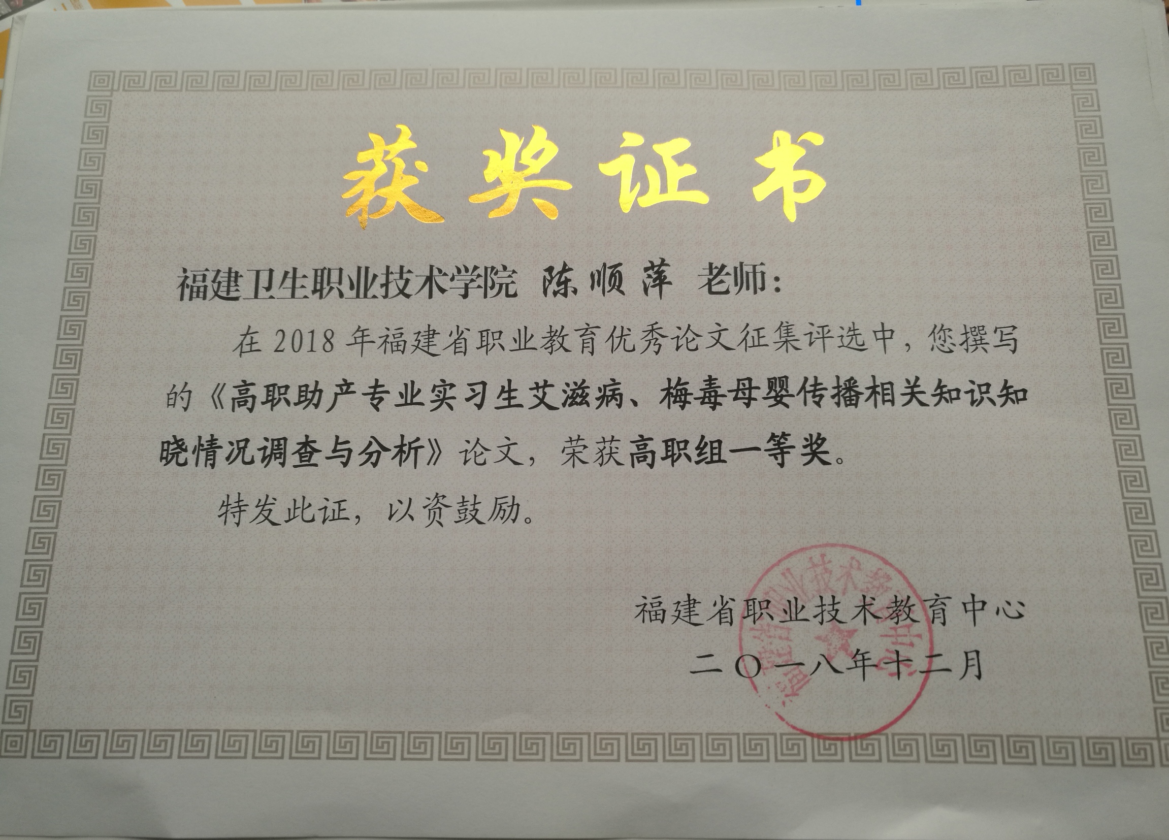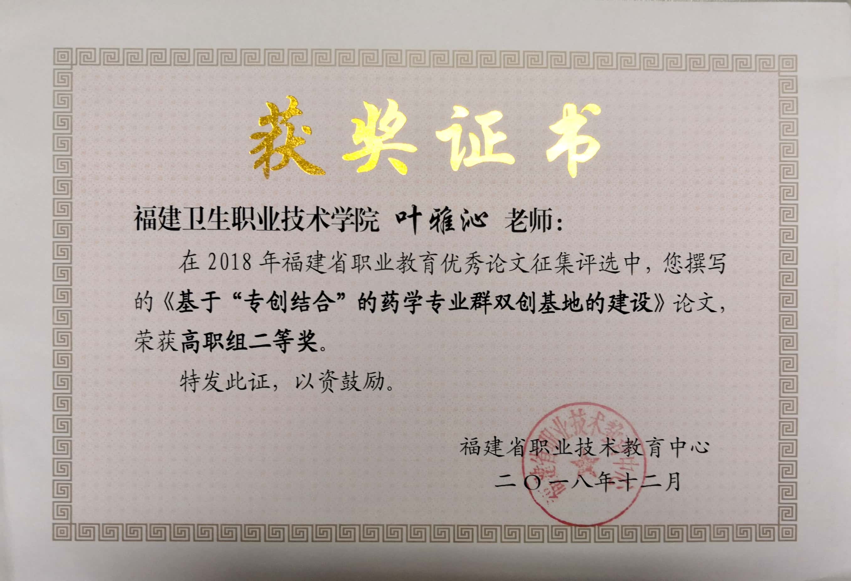 根據(jù)福建省職業(yè)技術(shù)教育中心的評選結(jié)果,陳順萍老師撰寫的論文《高職助產(chǎn)實(shí)習(xí)生艾滋病、梅毒母嬰傳播相關(guān)知識知曉情況調(diào)查與分析》喜獲2018年福建省職業(yè)教育優(yōu)秀論文評選高職組一等獎;曾武祈書記撰寫的論文《高職院校教育精準(zhǔn)扶貧的實(shí)踐與分析——以福建衛(wèi)生職業(yè)技術(shù)學(xué)院為例》、葉雅沁老師撰寫的論文《基于“專創(chuàng)結(jié)合”的藥學(xué)專業(yè)群雙創(chuàng)基地的建設(shè)》喜獲2018年福建省職業(yè)教育優(yōu)秀論文評選高職組二等獎;龔海蓉老師撰寫的論文《大賽資源轉(zhuǎn)化:促進(jìn)“教賽一體”實(shí)現(xiàn)的關(guān)鍵》喜獲2018年福建省職業(yè)教育優(yōu)秀論文評選高職組三等獎。