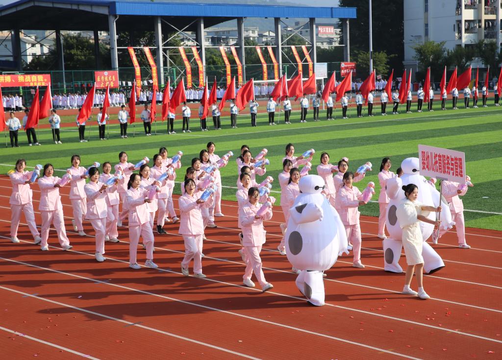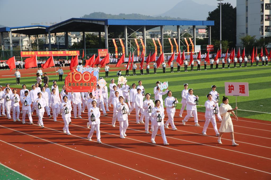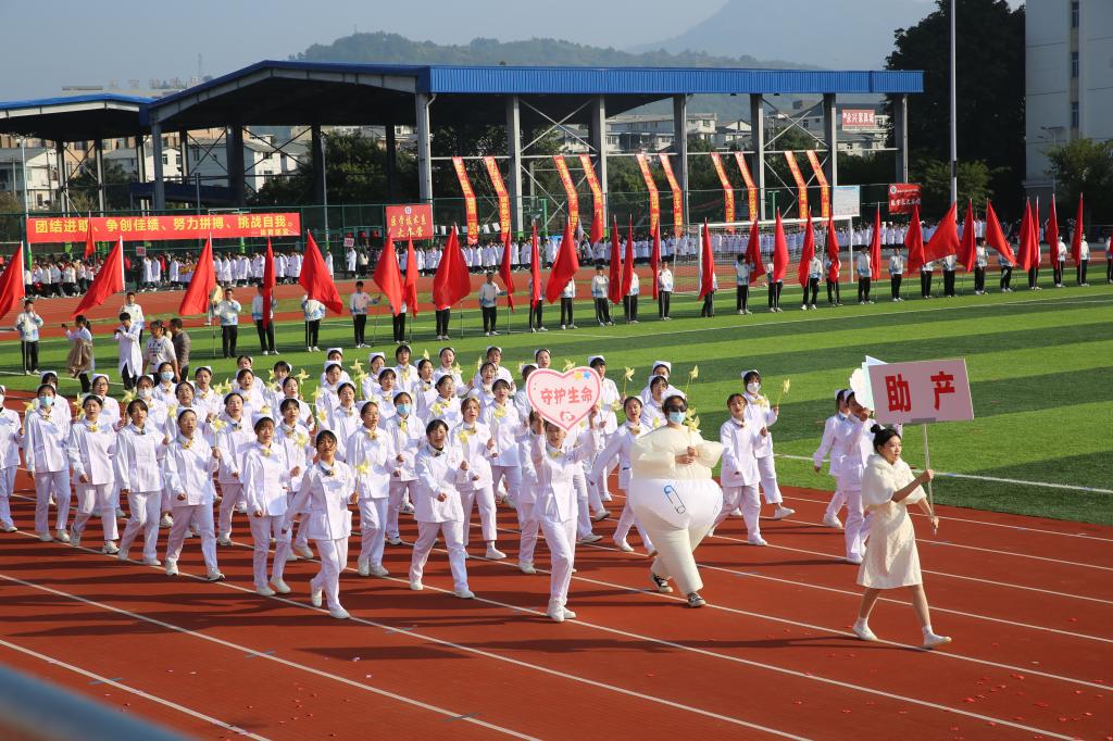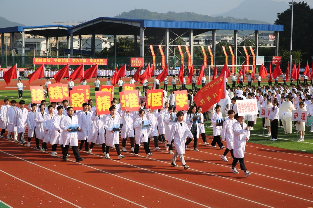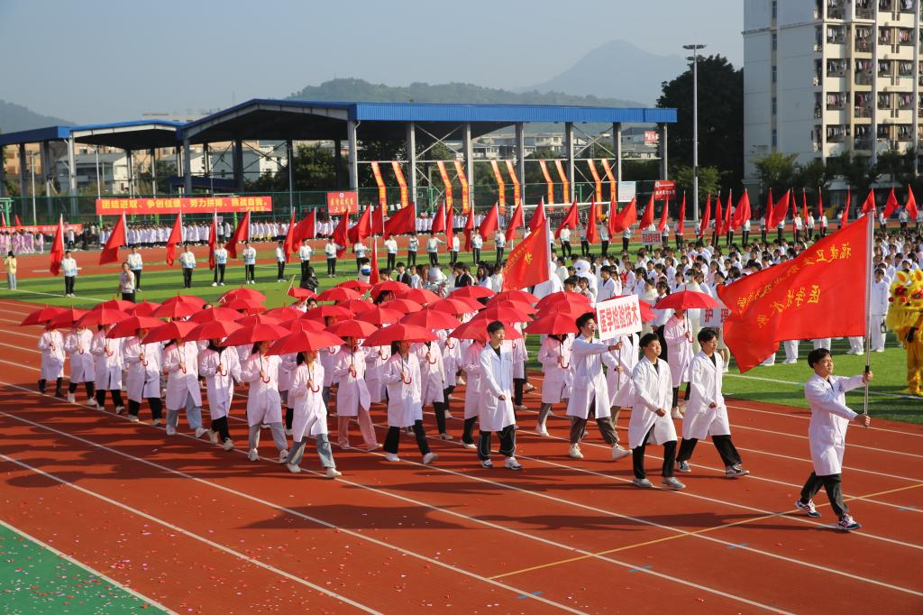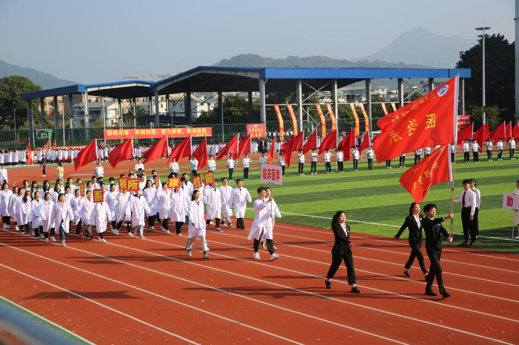 伴隨著《運(yùn)動(dòng)員進(jìn)行曲》,國(guó)旗校旗護(hù)旗隊(duì)、會(huì)徽會(huì)牌隊(duì)、鮮花彩旗隊(duì)依次精彩亮相,各院系運(yùn)動(dòng)員代表、教職工代表、裁判員代表以飽滿的姿態(tài)和昂揚(yáng)的精神,成為運(yùn)動(dòng)場(chǎng)上一道靚麗的風(fēng)景線。他們充分展現(xiàn)了學(xué)校緊跟“健康中國(guó)”“健康福建”步伐,致力“醫(yī)體融合”“體教融合”發(fā)展,推動(dòng)全民健身與全民健康深度融合的工作成效。