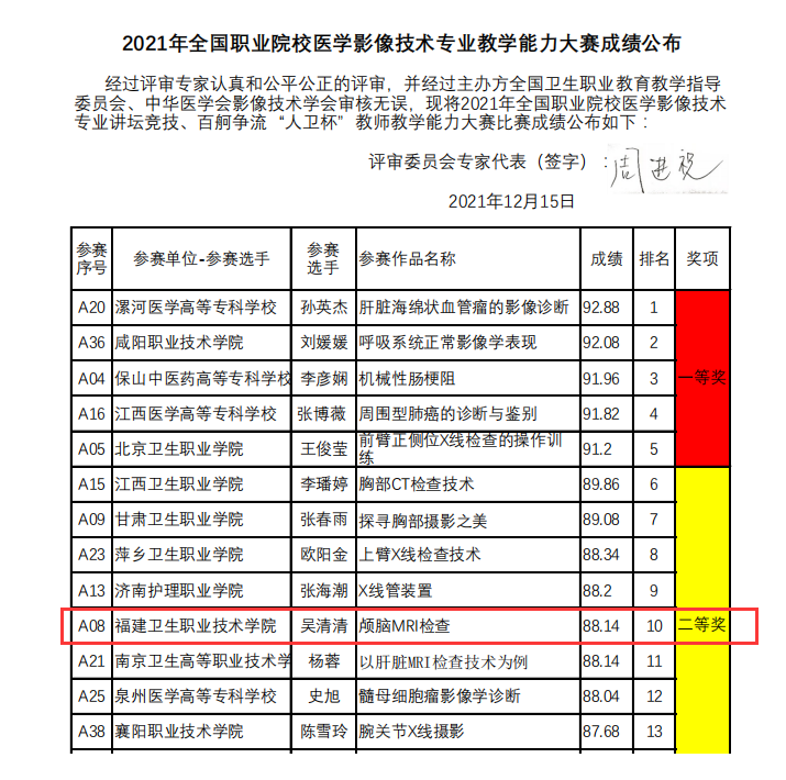 12月15日,由全國衛(wèi)生職業(yè)教育教學指導委員會、中華醫(yī)學會影像技術(shù)分會主辦的2021年全國職業(yè)院校醫(yī)學影像技術(shù)專業(yè)教學能力大賽總成績公布,我校醫(yī)學技術(shù)系吳清清老師的參賽作品《顱腦MRI檢查》榮獲二等獎。